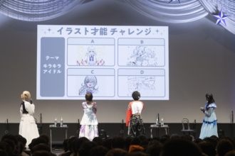 ここからは企画コーナー。最初の企画は、キャストが演じるキャラクターとのシンクロ率を試す「キャラクターシンクロチャレンジ」。キャラクターのプロフィールや特技にちなんだお題に挑戦し、その成功度を競うというもので、キャスト陣の気合も十分だ。トップバッターは、イラストが得意な栗田りんを演じる立花日菜が挑戦する「イラスト才能チャレンジ」。「キラキラアイドル」というお題に沿って事前に描いたイラストを、他のキャスト3名が描いたものと混ぜ、観客が「最も才能を感じるイラスト」を拍手で選ぶという企画だ。絵には自信がないという立花は「本当に苦しくて、泣きそうになりながら描きました(笑)」「色でごまかしてる」など終始不安げで、さらにはほかのイラストのレベルの高さに「本気出しすぎです!」とぼやくなど、観客の笑いを誘っていた。結果的には、会話の流れで立花が描いたイラストがどれなのかが分かり、観客の後押しもあって見事にチャレンジ成功。幸先の良いスタートとなった。