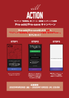 そして、9月26日から「ACTION」のPre-Add & Pre-Save キャンペーンがスタート。Apple Musicの “Pre-Add”、Spotifyの “Pre-Save”いずれかに指定のURLから登録した方に、ここだけでしかゲットできない「TVアニメ『桃源暗鬼』オリジナルスマホ壁紙-桃寺神門ver.-」をもれなくプレゼント。遂に新曲「ACTION」の全貌が明らかになる10月3日の配信スタートに備えるためにも本キャンペーンにぜひ参加してほしい。