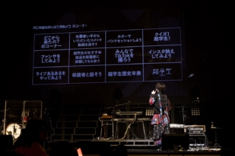 ミステリアスな雰囲気を醸しつつも、MCではフレンドリーに保護者に話しかける超学生。超学生を知ったキッカケを客席に尋ねると、この日はほとんどが“歌ってみた”動画であることが判明。「非常にありがたい話でありますので、ここからは“歌ってみた”を3曲連続でやっちゃいます。つまり大阪の会場がインターネットになってしまいます! 」と述べて、原口沙輔の「イガク」、DECO*27「ラビットホール」、jon-YAKITORYの「混沌ブギ」を一気に駆け抜けた。