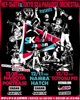 「SKAramble Japan」は、2019年にスタートしたHEY-SMITHと東京スカパラダイスオーケストラによる共同企画。2025年は、12月10日名古屋COMTEC PORTBASE、12月11日なんばHatch、12月13日豊洲PITの3公演の開催。名古屋&大阪公演には、POTSHOT・SHANKが、そして東京公演にはMONGOL800・SNAILRAMP・FIVE STATE DRIVEの出演が決定。チケットのオフィシャル2次先行もスタートし、10月19日まで申し込みとなっているのでチェックして欲しい。