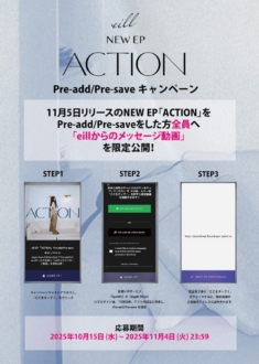 2025年11月5日 (水) 配信開始のNew EP「ACTION」のリリースを記念して、Apple Music/Spotifyを対象に、Pre-add/Pre-saveキャンペーンを開催いたします。実施期間中にPre-add/Pre-saveをした方全員へ「eillからのメッセージ動画」を限定公開