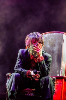 この日彼が装着していた仮面は、主に顔の右半分を覆うクリスタルガラス製のもので、彼が上手(かみて)を向けば口元以外を仮面で覆った姿が、下手(しもて)を向けば生身の表情が見える。その姿は人間以外の生命体と人間の一人二役のようでもあり、ヒューマノイドロボットのようでもあり、二面性の象徴のようでもあり、輝きによりさらに強化された超学生と生身の彼自身のコントラストのようでもあった。